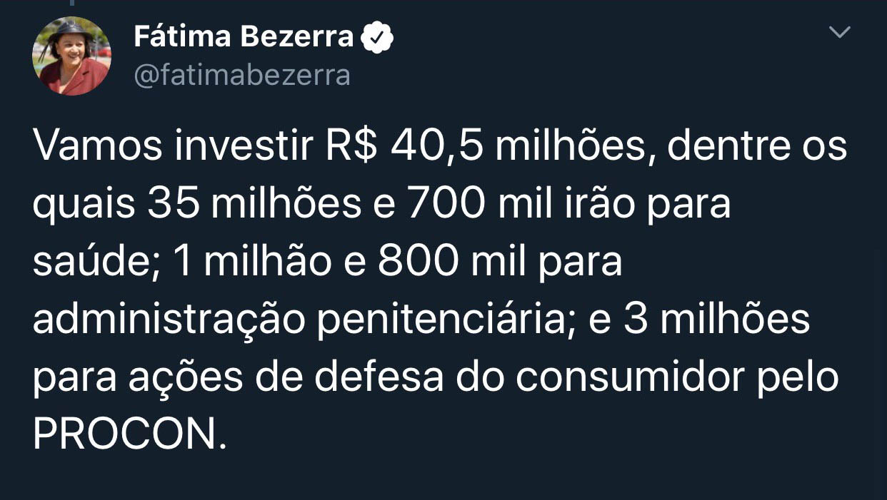 O valor foi divulgado em meio ao decreto editado pelo governo do estado, com medidas financeiras de combate à doença. De acordo com Fátima, desse valor, R$ 35,7 milhões irão para Saúde; R$ 1,8 milhão para Administração Penitenciária; e R$ 3 milhões para ações de defesa do consumidor pelo PROCON.