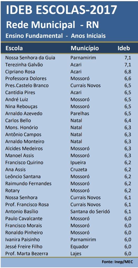 Outras escolas de Mossoró aparecem na lista das melhor avaliadas, como a André Luiz (6,5), Niná Rebouças (6,5), Alcides Medeiros (6,3), Manoel Assis (6,3), Leôncio de Santana (6,2), Raimundo Fernandes (6,2), Rotary (6,2), Paulo Cavalcante (6,0), Francisco Morais (6,0) e Ronaldo Pinheiro (6,0).