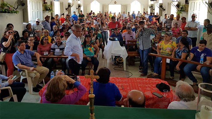 O encontro de hoje ocorreu na igreja local, onde a chefe do Executivo estadual e sua equipe foram recebidos por parte das 200 famílias, representadas pelo Movimento dos Atingidos e Atingidas pela Barragem.