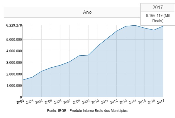 Em 15 anos, o PIB do município passou de cerca de R$ 1,5 bilhão (em 2002) para R$ 6,1 bilhões em bens e serviços produzidos, no último ano do estudo. Esse valor representa 0,65% do PIB de toda a região região.