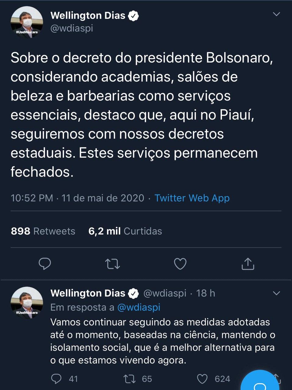 Wellington Dias, do Piauí, afirmou que academia, salões de beleza e barbearias permanecem fechados no estado e que seguirá as medida adotadas até agora, baseadas na ciência.