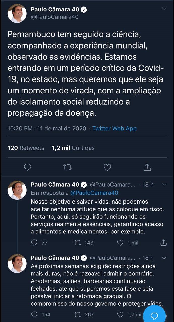 O governador de Pernambuco, Paulo Câmara, disse que o objetivo do governo do estado é salvar vida e que não pode aceitar “nenhuma atitude que as coloque em risco”. Disse, ainda que o estado está em um período crítico e que irá ampliar o isolamento.