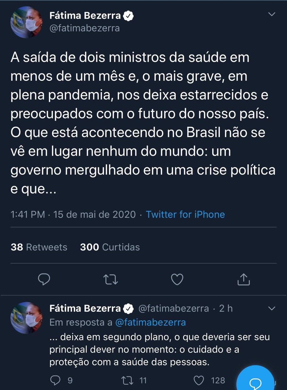 A Governadora do Rio Grande do Norte, Fátima Bezerra, se manifestou, por meio de sua conta em uma rede social, sobre a saída de Nelson Teich do Ministério da Saúde.