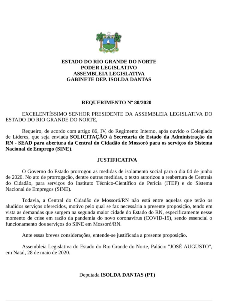 Durante a sessão remota desta quinta-feira (18) a Deputada Estadual Isolda Dantas (PT) fez uma indicação ao Governo do Estado e à Secretaria de Estado da Administração (SEAD), solicitando a reabertura da Central do Cidadão de Mossoró, localizada no Terminal Rodoviário da cidade, bem como serviços do Instituto Técnico-Científico de Perícia (ITEP) e do Sistema Nacional de Empregos (SINE).