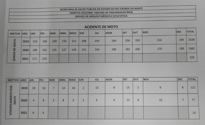 O Hospital Regional Tarcísio Maia informa que atendeu 1.423 pessoas vítimas de acidentes com moto da região Oeste do Rio Grande do Norte, nos 12 meses de 2020.