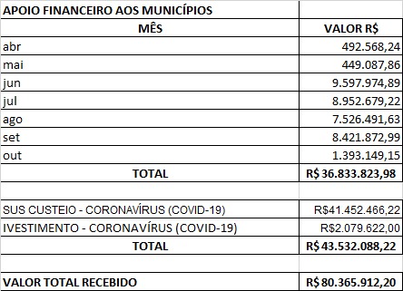 Deste total, R$ 36.833.823,98 foram exclusivos de apoio financeiro ao município para desenvolver ações contra a pandemia. Os outros 43.532.088,22 foram destinados, ao longo do ano, para instalação e custeio dos leitos de UTI Covid-19.