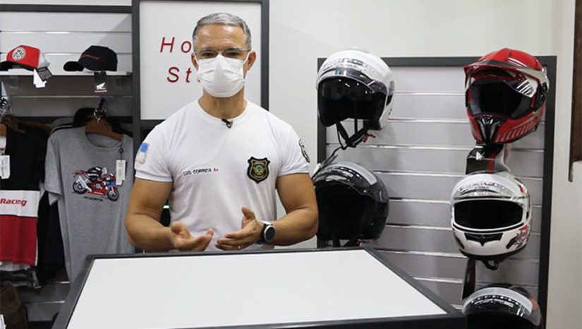 Em seguida, Luiz detalha a importância de a viseira ser totalmente transparente e sempre trafegar com ela protegendo os olhos de abelhas, mosquitos e até pedras.