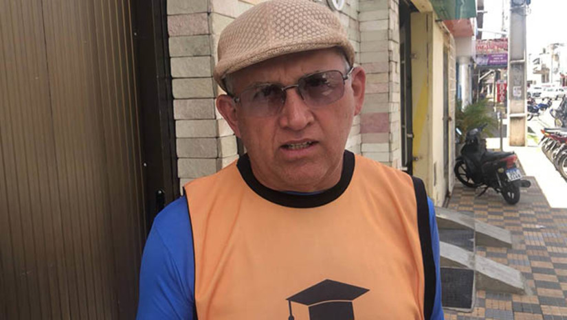 O MH encontrou Seu Francisco da Merenda no Centro de Mossoró, segurando um banner de adesivos de santos e de times de futebol, oferecendo aos presentes de loja em loja.