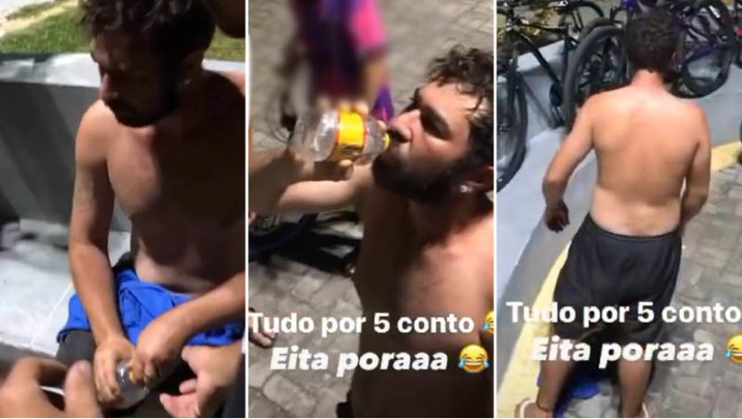 Nas imagens, os jovens incentivam o homem a tomar rapidamente uma garrafinha de uma bebida chamada “Corote”. Em seguida, fazem chacota com a situação de embriaguez que ele se encontra.