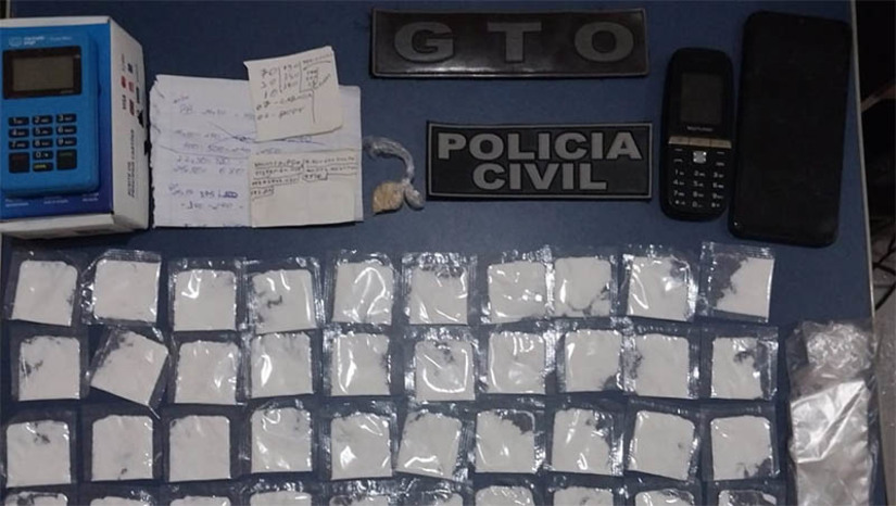 No local os policiais apreenderam 50 porções de cocaína, "crack", sacos plásticos utilizados para embalar entorpecentes, máquinas de cartão, aparelhos celulares, uma placa de motocicleta e uma moto. O suspeito não foi localizado.