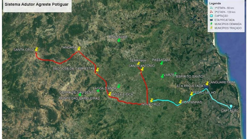 O Sistema Adutor Agreste Potiguar compreende duas etapas. A primeira etapa (já inclusa no Novo Programa de Aceleração do Crescimento – Novo PAC do Governo Federal) terá extensão de 59Km e atenderá os municípios de Canguaretama, Pedro Velho, Montanhas e Nova Cruz.