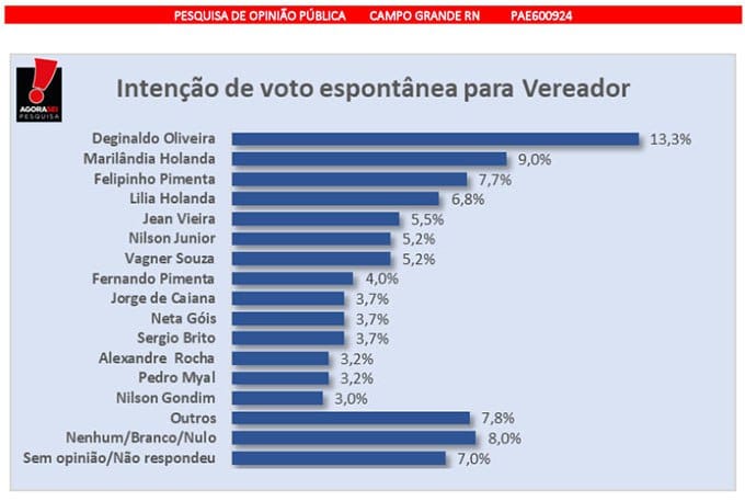 O Instituto AgoraSei/Jornal Mossoró Hoje, divulga, neste sábado, dia 5 de outubro de 2024, pesquisa de opinião pública para prefeito e vereador do município de Campo Grande-RN.