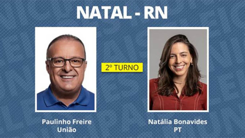 Paulinho Freire (União) e Natália Bonavides (PT) vão disputar, no dia 27 de outubro, o 2º turno da eleição para a prefeitura de Natal (RN). Com 100% das seções totalizadas, Freire conquistou 171.146 votos (44,08% dos votos válidos), e Natália recebeu 110.483 votos (28,45%).