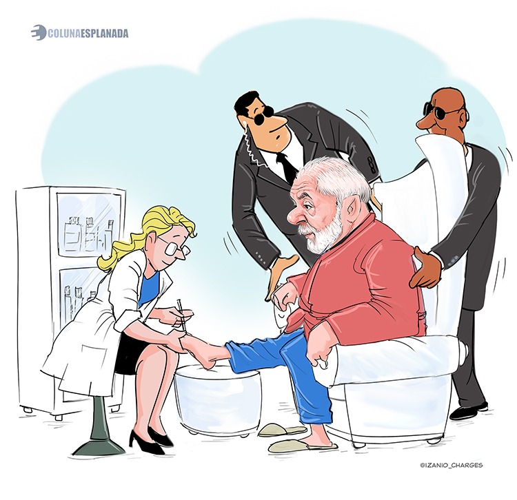 O presidente Lula da Silva precisa urgente de uma pedicure. Ele estava cortando as unhas dos pés, sentado num banquinho no box da suíte do Palácio, quando o banco tombou para um dos lados e houve a queda, na qual bateu a cabeça no chão de mármore. A primeira-dama, dona Janja, que acaba de trocar carpetes e cortinados, já mandou instalar também tapetes antiderrapantes nos banheiros.