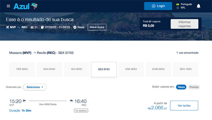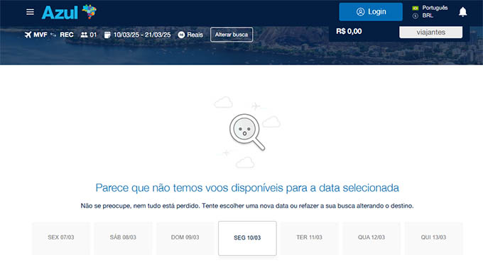 Ao verificar o site da Azul e buscar por passagens é possível ver que a oferta de voos, a partir do dia 10 de março, já está suspensa. Veja abaixo:
