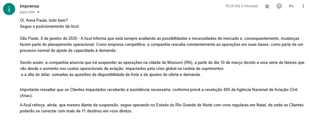 A Azul não informou se a suspensão é temporária ou definitiva e afirmou que continuará a operar no Rio Grande do Norte, com voos a partir do Aeroporto Internacional de Natal, localizado no município de São Gonçalo do Amarante.